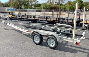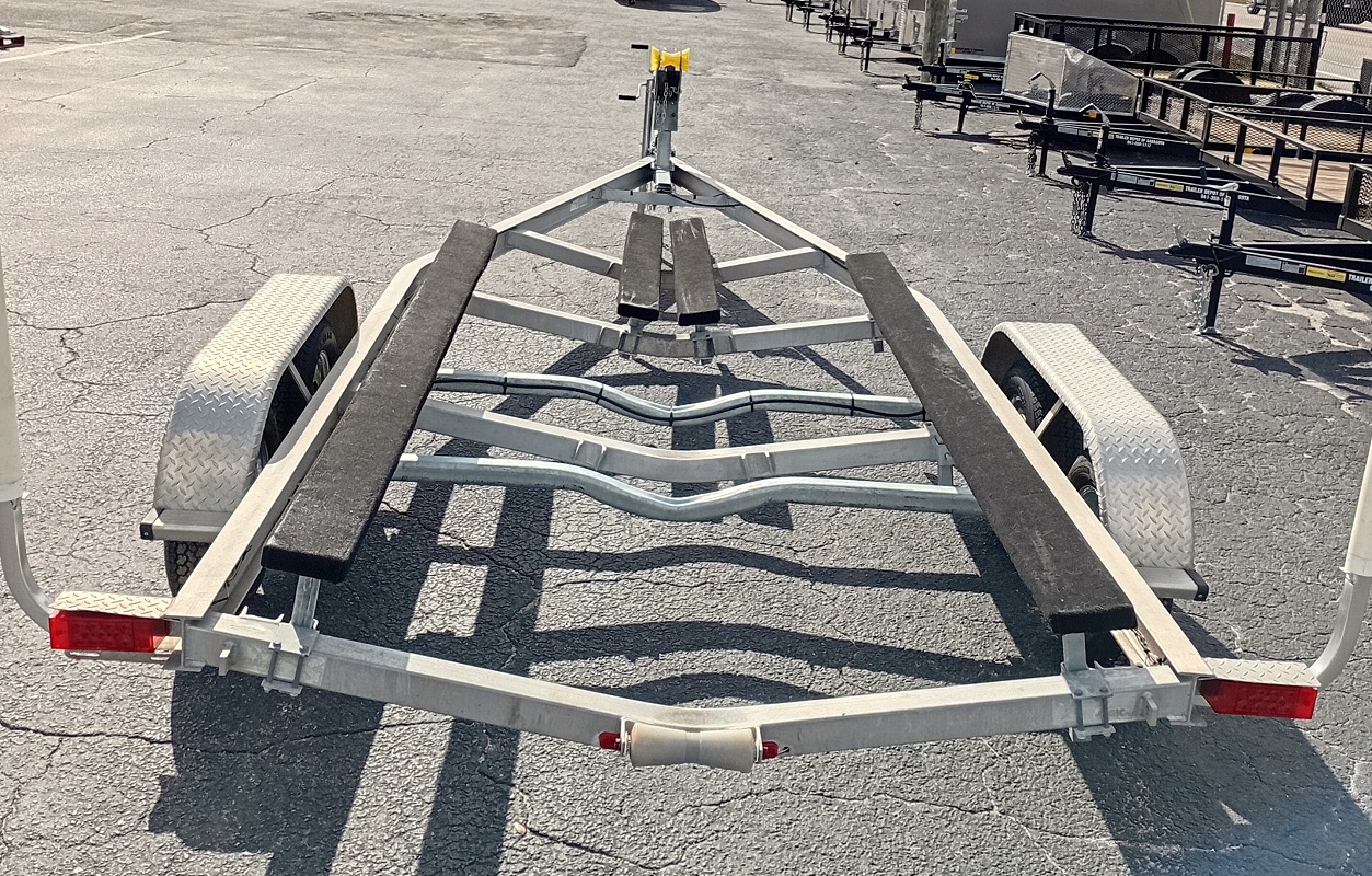 This trailer has been sitting in our back lot for several years, waiting its turn to be pulled in and refurbished. We don’t know how much service it saw, but it couldn’t have been much given its age and how long it sat unused. The frame and axles showed little sign of usage and are very heavy-duty. All other parts that don’t weather so well got replaced. This trailer is best suited for a medium to deep-v hull. This is an excellent chance to own a sound trailer at a greatly reduced price.